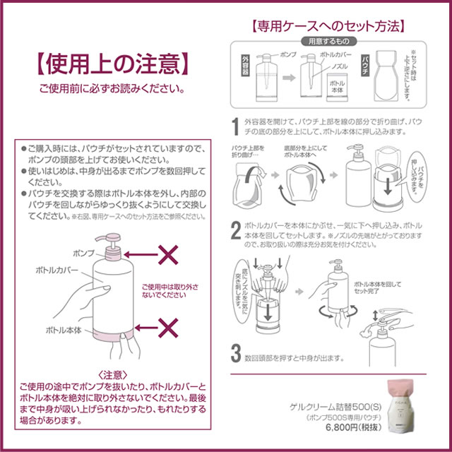 ポンプSタイプ専用の詰替用ですので、初めてご購入のお客様は、「エバメール ゲルクリーム ポンプSタイプ 500g ≪真空パウチタイプ≫」の方を先にお買い求めくださいませ。