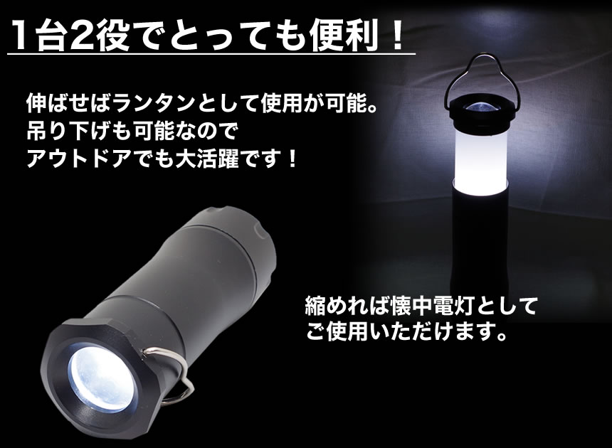 ■商品説明 1台2役のLEDハンディライト 伸ばせばランタンとして使用が可能! 吊り下げも可能なのでキャンプやアウトドアでも大活躍です。